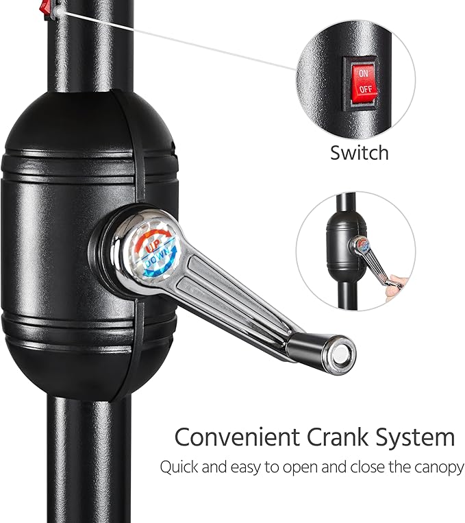 - Convenient Crank Lift & Tilt Adjustment: The crank market umbrella is effortless to operate by turning the crank lever. The umbrella canopy can be manually tilted in 2 directions with a push at the button to create a more flexible and versatile shade