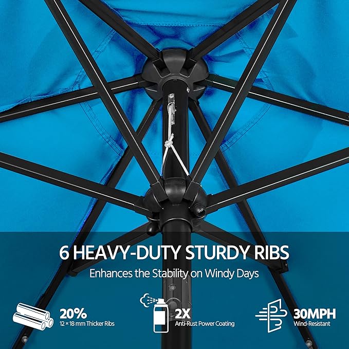 - Strong & Stable: This patio umbrella consists of a 7.5ft canopy made of water-resistant polyester, 6 metal ribs and an anti-rust powder-coated metal pole with a 1.5” diameter. A wind-vented canopy enhances the stability of the umbrella on windy days