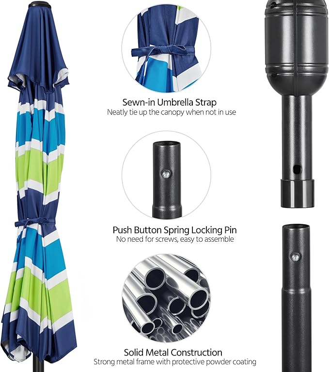 - Convenient Crank: This market umbrella helps you to open and close the canopy effortlessly and quickly, offering shade over a patio furniture set of a 42" to 54" table and 4 to 6 chairs or 2 pool loungers