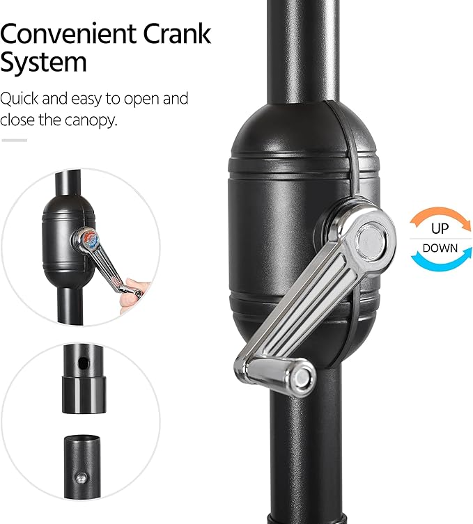 - Convenient Crank: This market umbrella helps you to open and close the canopy effortlessly and quickly, offering shade over a patio furniture set of a 42" to 54" table and 4 to 6 chairs or 2 pool loungers