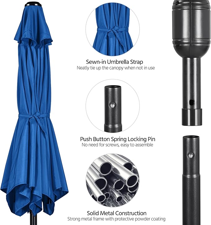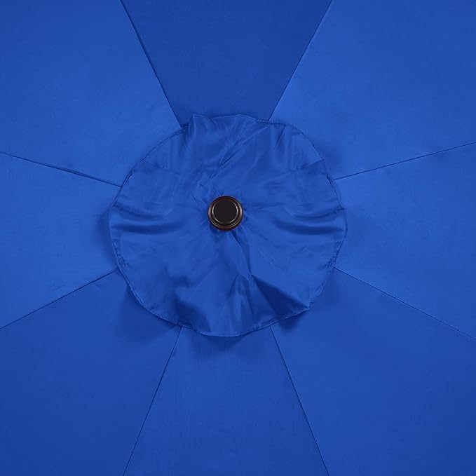 - Specifications: Canopy color: Royal Blue; Material: 180g polyester, powder-coated iron; Umbrella rib qty.: 8; Canopy diameter: 9ft; Overall height: 7.9ft; Umbrella pole diameter: 1.5”; Package includes: patio umbrella, assembly instructions