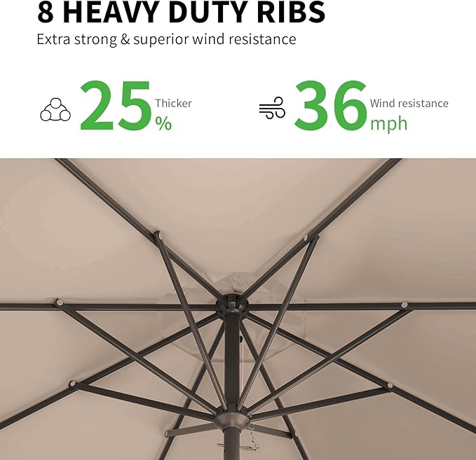 - STURDY & DURABLE - AreShark always puts safety first. To reduce swaying and increase overall strength of our beach umbrella, the entire structure of yard umbrella is made of sturdy iron material. Powder coated iron pole and 8 sturdy ribs provides stronger support and are built for stability