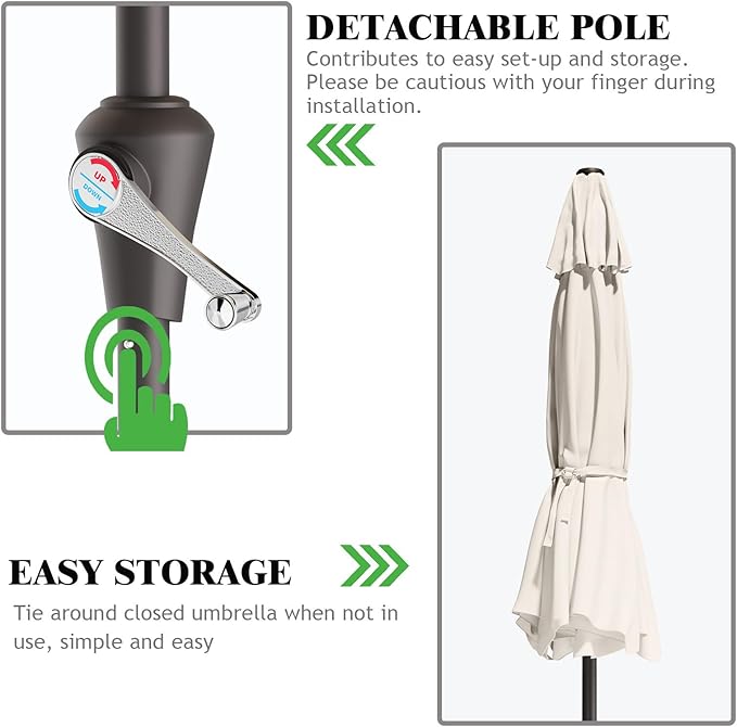 - QUICK SETUP - Detachable pole contributes to easy setup and storage (Note: Umbrella base not included, when used as free standing pool umbrella, it needs over 26.5lb (12KG) patio umbrella stand); Pairing Suggestion - ASIN: B0DPC4G9CS