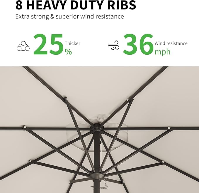 - FADE RESISTANT & WATERPROOF - The 10ft patio umbrella is crafted from premium outdoor-rated 100% polyester fiber, this sizable canopy stands up to the elements. Water beads up and rolls away, keeping you dry even on rainy days