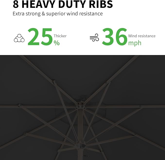 - FADE RESISTANT & WATERPROOF - The 12ft patio umbrella is crafted from premium outdoor-rated 100% polyester fiber, this sizable canopy stands up to the elements. Water beads up and rolls away, keeping you dry even on rainy days