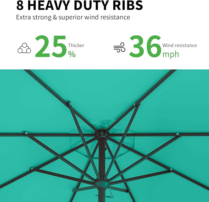 - FADE RESISTANT & WATERPROOF - The 9ft patio umbrella is crafted from premium outdoor-rated 100% polyester fiber, this sizable canopy stands up to the elements. Water beads up and rolls away, keeping you dry even on rainy days