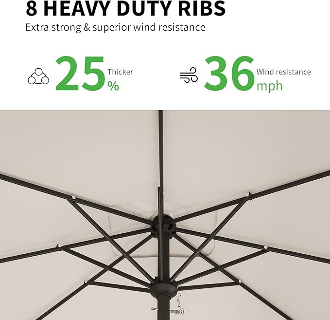 - FADE RESISTANT & WATERPROOF - The 8*10ft rectangle patio umbrella is crafted from premium outdoor-rated 100% polyester fiber, this sizable canopy stands up to the elements. Water beads up and rolls away, keeping you dry even on rainy days