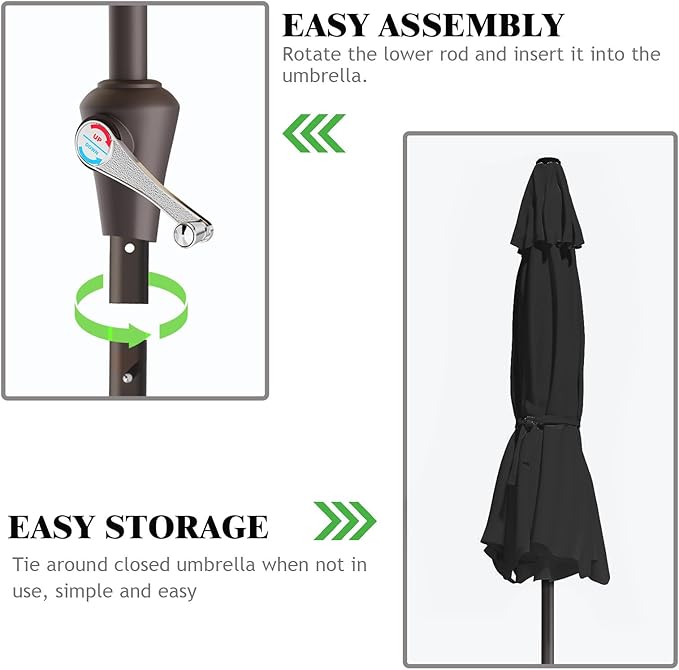 - CONVENIENT CRANK HANDLE - Adjusting the shade is simple with the crank-lift system. A few turns raises the canopy to the perfect height. Lowering is just as easy - no heavy lifting required. The tilt mechanism follows suit with an intuitive push-button design. A brief press angles the umbrella outdoor patio however you like. Find just the right shading whether seated or standing