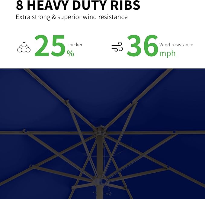 - STURDY & DURABLE - AreShark always puts safety first. To reduce swaying and increase overall strength of our beach umbrella, the entire structure of yard umbrella is made of sturdy iron material. Powder coated iron pole and 8 sturdy ribs provides stronger support and are built for stability