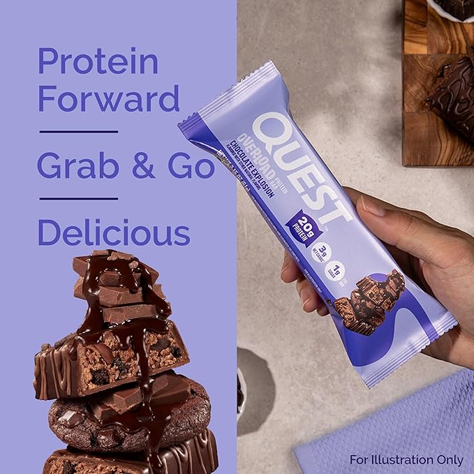- AT HOME OR ON-THE-GO. Quest Chocolate Explosion Bar with 20g of grab & go protein is just right for elevating the morning commute, as a tasty treat at your desk, or a delicious way to refuel after a workout.*Per Serving