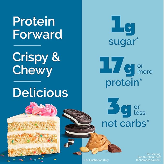 - PROTEIN FORWARD. 17-18g of protein, 1g of sugar, and 2-3g of net carbs per serving. They’re the deliciously sweet, easy-breezy cheat to align with your fitness goals while enjoying your favorite Quest flavors.