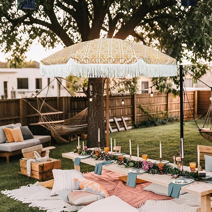 - Tassel design umbrella will add a fresh look and unique appearance to your patio or outdoor moment. Ideal for the backyard, lawn, and garden.