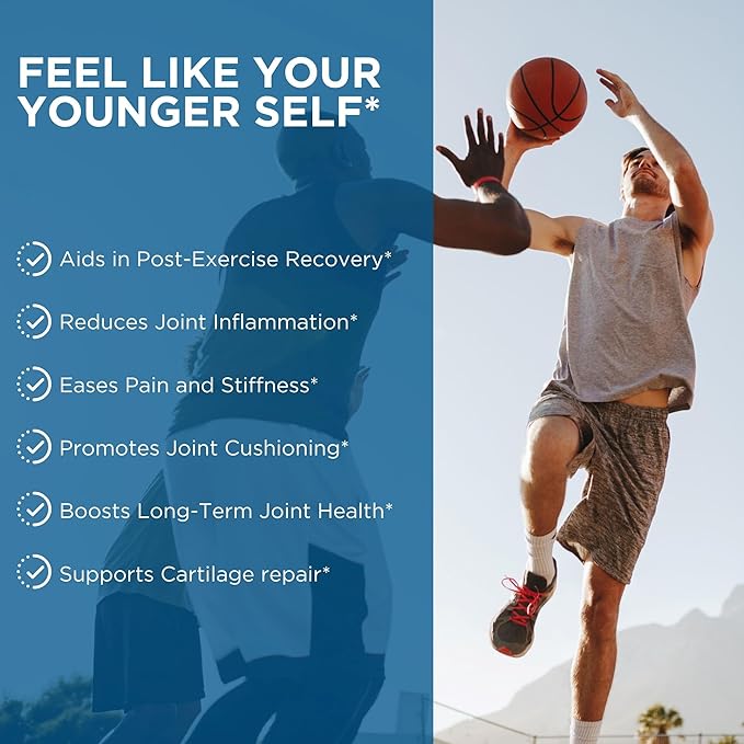 - PREMIUM INGREDIENTS FOR OPTIMAL JOINT HEALTH - Packed with Glucosamine Sulfate and Chondroitin Sulfate to protect and rebuild cartilage, Boswellia & Turmeric to fight inflammation and swelling, MSM, a natural sulfur, and Bromelain to support joint flexibility and comfort. Quercetin provides antioxidant protection, while Methionine aids in collagen production for stronger, healthier joints. Ideal for adults and seniors committed to healthy joints, bone, and cartilage to fuel an active lifestyle.