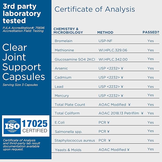 - CLEAN, SAFE & TRUSTWORTHY FORMULA - Crafted with your health in mind, Clear Joint Support uses only science-backed, natural, non-GMO ingredients, free from artificial additives and fillers & is Soy, Gluten & Dairy-free. Our premium supplement is manufactured in the USA in a GMP-certified facility to ensure the highest standards of safety, purity, & quality. A brand & product trusted by active, aging, & health-conscious people to deliver effective and affordable long-term joint comfort & health.