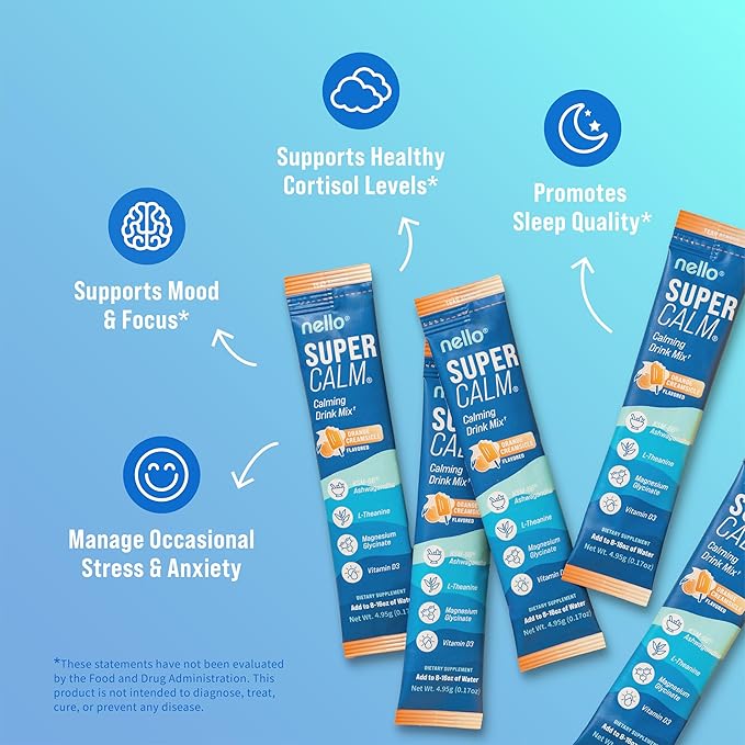 - REFRESH, RELAX, REFOCUS: Nello's SuperCalm supports you in effortlessly enjoying relaxation and focus anytime, anywhere. Savor the vibrant flavors of blue coconut in convenient, on the go packets or the multi-serving canister while promoting your body's vitality and equilibrium.