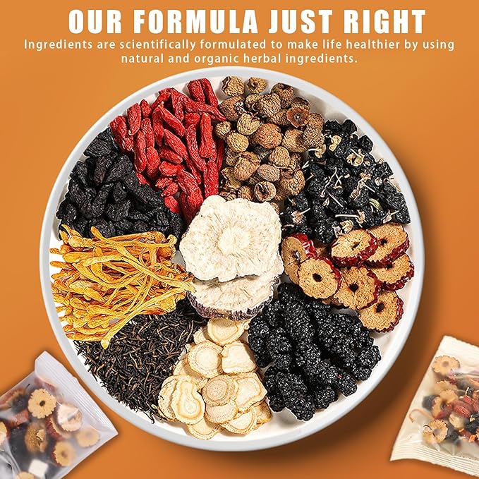 - NATURAL ADDITIVE-FREE: Men's Essentials Nine Treasure Tea Kidney Tea, Using carefully selected Ginseng (Five years or less artificial planting), Polygonatum sibiricum, Wolfberry, Chinese Yam, Mulberry, Red Date, Orange Peel, Maca, Eucommia ulmoides male flower etc. as raw materials, after scientific proportioning, natural drying, natural formula, without any additives, you can drink the ingredients with peace of mind.