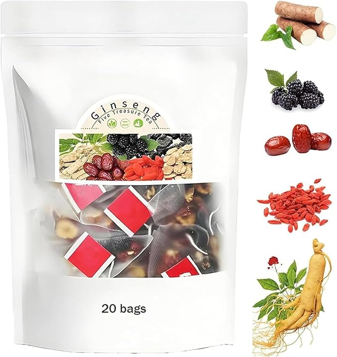 • Chinese tea for Men & Women: Ginseng Eight Treasure Tea combines the rich flavors of Red dates, wolfberries, mulberries, yellow essence, maca. ginseng(artificially grown for 5 years and less). This unique herbal blend supports kidney health and overall well-being, making it an essential addition to your wellness routine.