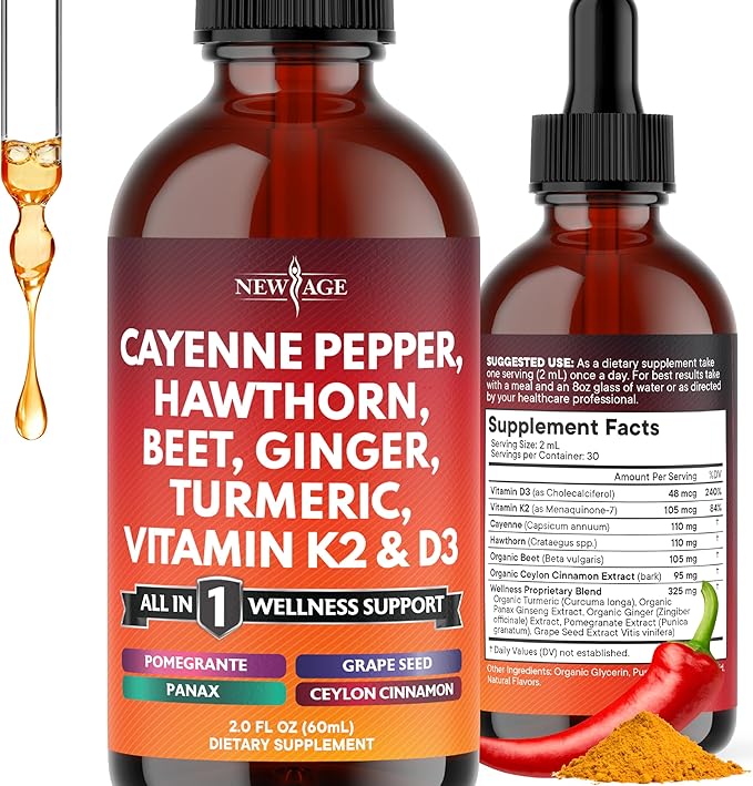 - New Age All-in-One Supplement Cayenne Pepper Liquid Drops – A potent combination of traditional herbs and essential vitamins, including organic Ceylon cinnamon, hawthorn berry extract, beetroot, turmeric, K2 D3 vitamins, ginseng, and berberine with Ceylon cinnamon. These vegetarian liquid drops deliver a concentrated plant-based formula designed to promote daily health and overall well-being.