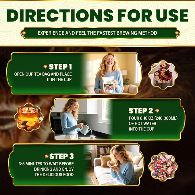 - Brewing Made Easy: To prepare your Ginseng Six Treasure Tea, simply place one bag in a cup, pour 95-100°C water over it, and let it steep for five minutes. Each tea bag can be brewed 5-6 times, allowing you to savor its flavors multiple times.