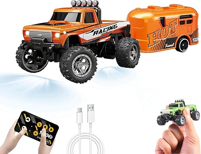 Mini RC Car, 1/64 Scale Mini Remote Control Monster Truck with Trailer, 2.4Ghz & APP Remote Control, Rechargeable Alloy Shell Mini RC Cars with Lights, Speed/Steering Adjustable (Orange)