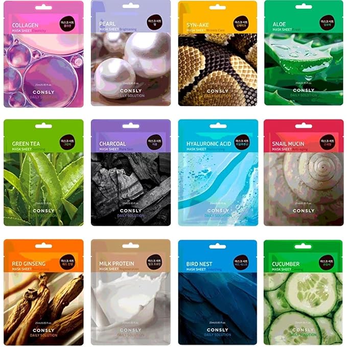 CONSLY_Daily Solution Face Mask Set – 12 Hydrating, Firming & Brightening Sheet Masks – Infused with Collagen, Snail Mucin, Hyaluronic Acid & Natural Extracts for Anti-Aging & Glowing Skin