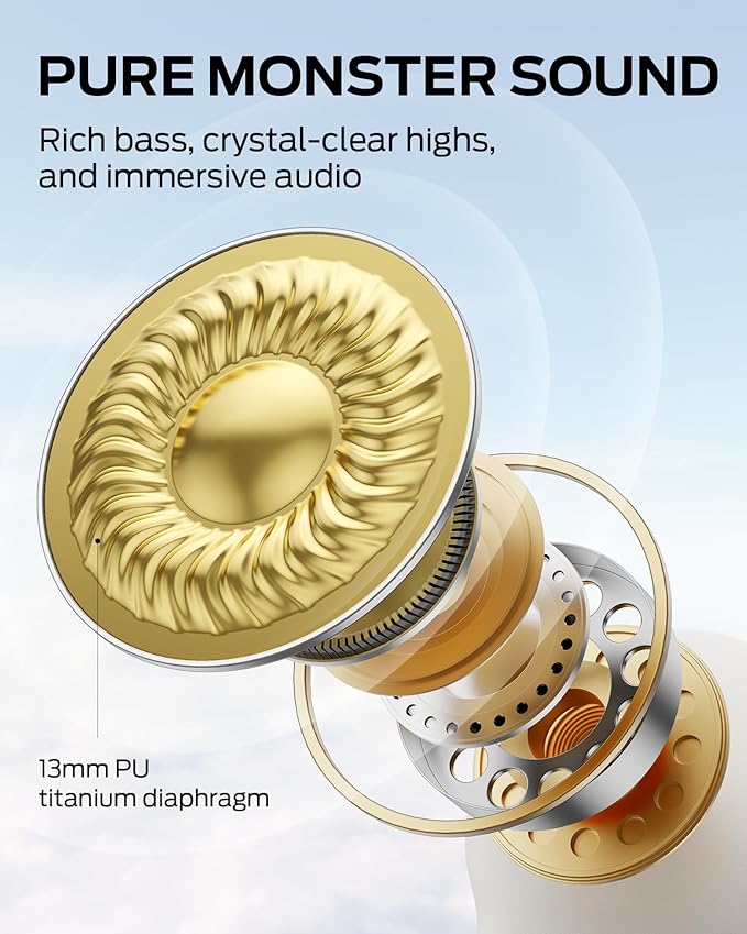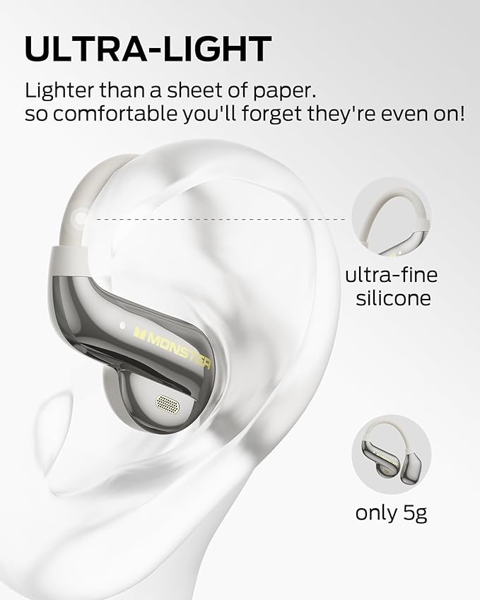 - Pure Monster Sound - Equipped with a 13mm PU titanium diaphragm driver, the Monster Open-Ear Headphones AC390 deliver a rich and dynamic audio experience. Crisp highs, full mids, and deep bass ensure exceptional sound quality across various music styles, offering a concert-like sensory experience anytime, anywhere with these open-ear earbuds.