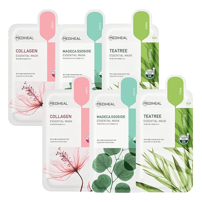Mediheal Sheet Mask Essential HERO 6 pack (Collagen, Tea Tree, Madecassoside)| Korean Skincare Facial Sheet Mask Combo Moisturizing, Soothing and for Blemishes