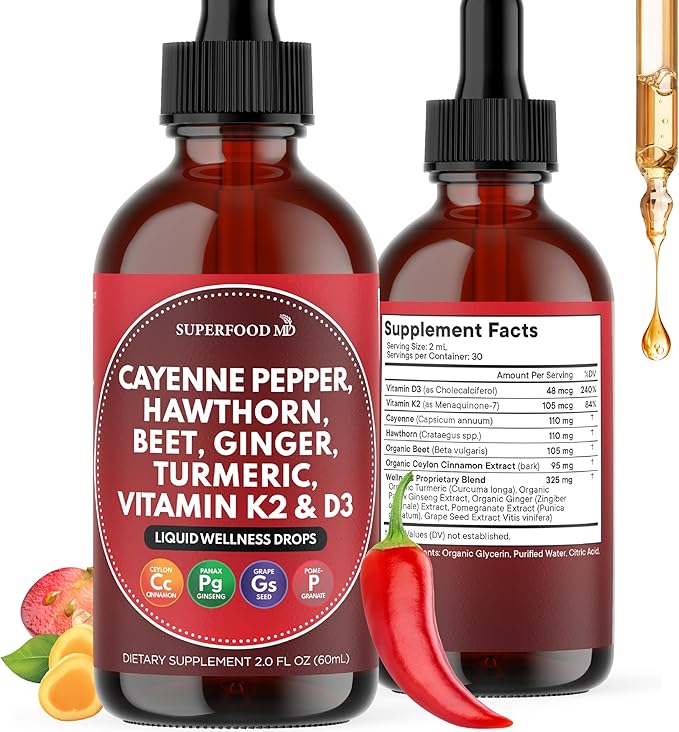 - Superfood MD Cayenne Pepper Liquid Drops – A potent combination of traditional herbs and essential vitamins, including organic Ceylon cinnamon, hawthorn berry extract, beetroot, turmeric, K2 D3 vitamins, ginseng, and berberine with Ceylon cinnamon. These vegetarian liquid drops deliver a concentrated plant-based formula designed to promote daily health and overall well-being.