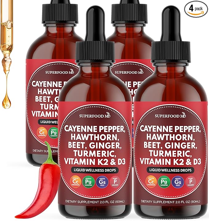 - Superfood MD Cayenne Pepper Liquid Drops – A potent combination of traditional herbs and essential vitamins, including organic Ceylon cinnamon, hawthorn berry extract, beetroot, turmeric, K2 D3 vitamins, ginseng, and berberine with Ceylon cinnamon. These vegetarian liquid drops deliver a concentrated plant-based formula designed to promote daily health and overall well-being.