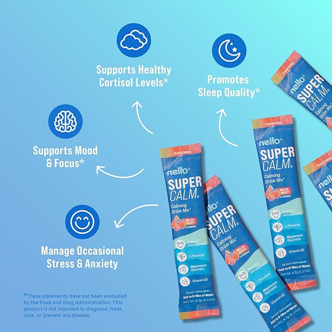 - REFRESH, RELAX, REFOCUS: Nello's SuperCalm supports you in effortlessly enjoying relaxation and focus anytime, anywhere. Savor the vibrant flavors of blue coconut in convenient, on the go packets or the multi-serving canister while promoting your body's vitality and equilibrium.