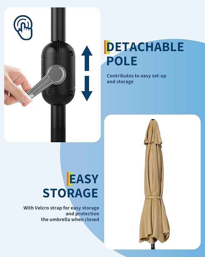 - 【Effortless Operation】: Open, close, or tilt the market umbrella in seconds using the intuitive push-button mechanism. Achieve perfect shade positioning across multiple angles with smooth single-hand adjustments.