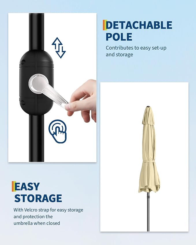 - 【Effortless Operation】: Open, close, or tilt the market umbrella in seconds using the intuitive push-button mechanism. Achieve perfect shade positioning across multiple angles with smooth single-hand adjustments.
