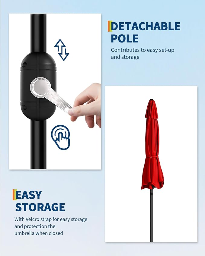 - 【Effortless Operation】: Open, close, or tilt the market umbrella in seconds using the intuitive push-button mechanism. Achieve perfect shade positioning across multiple angles with smooth single-hand adjustments.