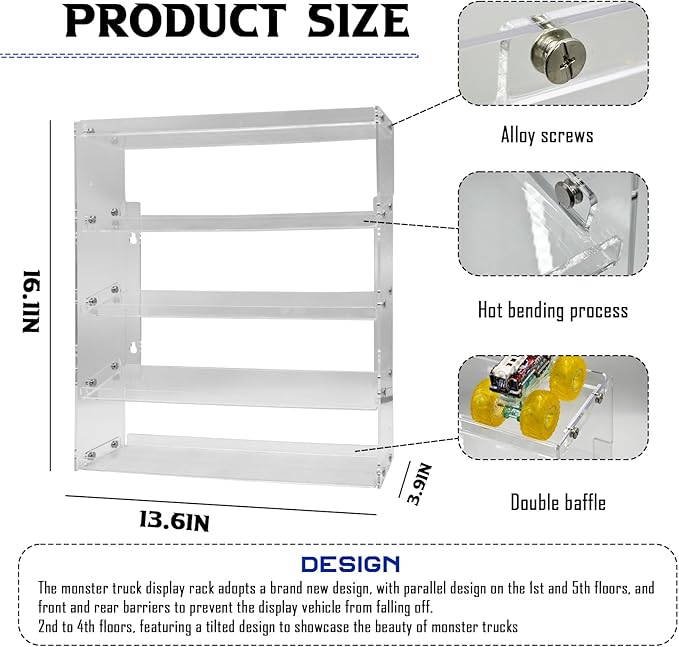 - Acrylic Material: The monster truck storage case is made of high-quality acrylic, strong and durable, which ensure the stability of the cars display shelf and provide long-time service