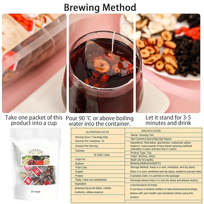 - 【GINSENG FIVE TREASURE TEA】Dry tea has a clear texture, and uniform size, they were dried when in fresh status, using a special process to preserve each herb's moisture