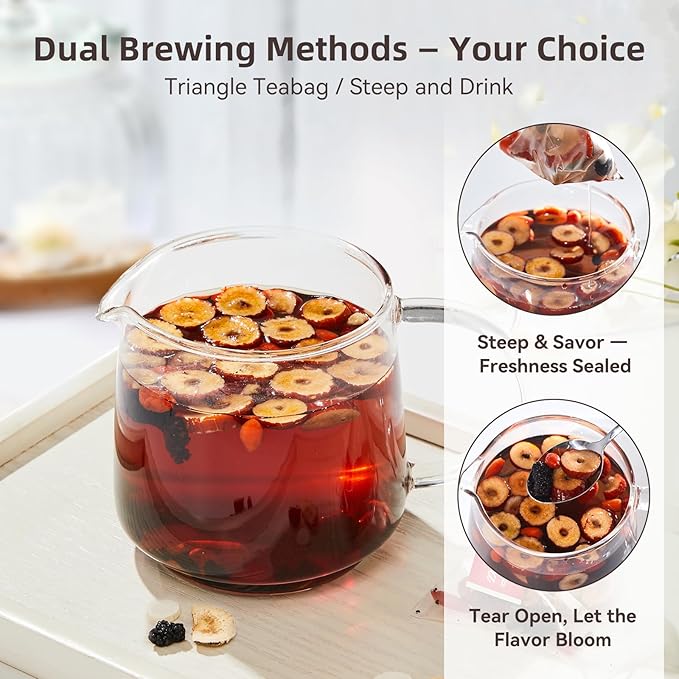 - Exceptional Taste Experience: The ginseng five treasures tea soup exudes the natural sweetness of red dates and mulberries, perfectly integrated with the rich flavors of ginseng and polygonatum. With a rich color and abundant nutrition,individually wrapped in triangle-shaped bags with built-in filters for easy brewing,you can add honey or rock sugar according to your personal taste for a customized delicious treat.