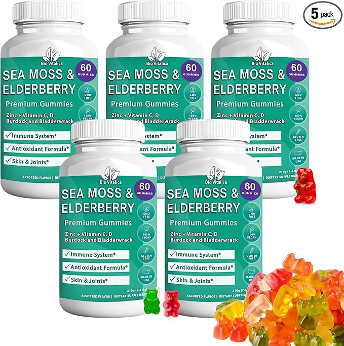 - The most effective formula. Sea Moss and Elderberry gummies by BioVitalica contains Sea moss, Bladderwrack and Burdock root, Elderberry, Vitamin C, D, and Zinc. In the form of gummies, vitamins are better-absorbed by the body. It is an immune cocktail in just 2 gummies a day.