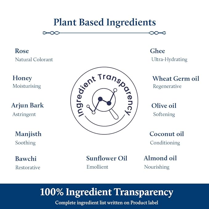 - Lip Moisturizer with Natural Ghee: The combination of rose and ghee provides excellent moisturizing properties, acting as a nourishing lip oil. Ideal for very dry lips, it ensures your lips stay soft, supple, and kissable all day long.