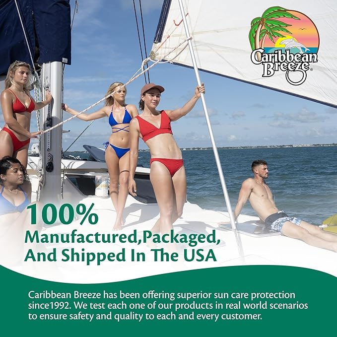 - 100% MANUFACTURED, PACKAGED, AND SHIPPED IN THE USA. Caribbean Breeze has been offering superior sun care protection since 1992. We test each one of our products in real world scenarios to ensure safety and quality to each and every customer.