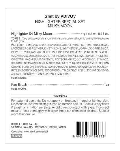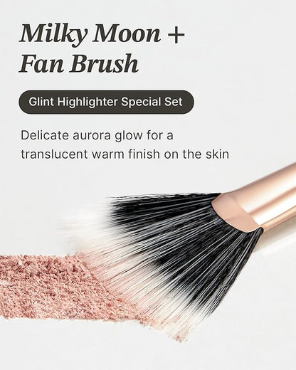 - GLINT HIGHLIGHTER SPECIAL SET - Glint Highlighter, a baked masterpiece, offers a luminous, high-end glow in two mesmerizing shades. Milky Moon provides a subtle milky pink shimmer on a creamy base, perfect for cool-toned skin. Dewy Moon offers a champagne-hued, natural shimmer with warm beige undertones, ideal for neutral to warm-toned skin. Each set comes with a Glint Highlighter (2.3g/0.08oz) and a fan brush.