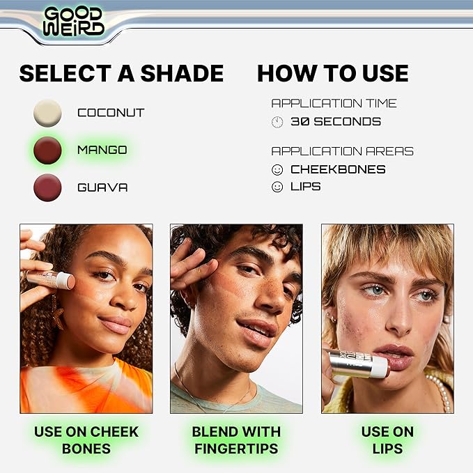- Versatility at Its Best: Be it a radiant cheek tint, a luscious lip shade, or a mid-day touch-up, our Balmy Weather Moisture Stick in Mango is your golden ticket to shine. Step into the world of Good Weird and bask in the warmth.