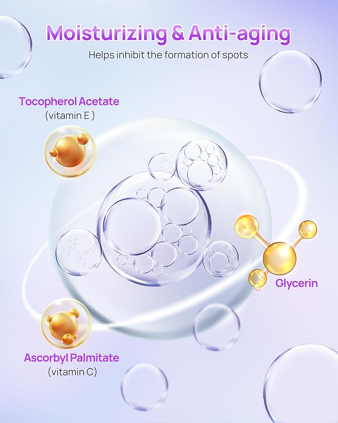 - Moisturizing & Anti-aging -- Glycerin, tocopherol acetate(vitamin E ), Ascorbyl palmitate(vitamin C) to help moisturize, anti-aging, and inhibit the formation of spots. Non-comedogenic, cruelty-free.