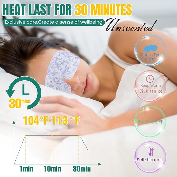 - 【Constant temperature and comfort 】Self Heating Moist Heated Eye Masks is made of upgraded cotton non-woven fabric, which is breathable, soft and comfortable to wear, skin friendly, and low sensitivity. The temperature ranges from 104 ℉ to 113 ℉ and can maintain warmth for approximately 30 minutes. When using a hot compress eye mask, you can feel your eyes warmer and more comfortable, helping you fall asleep quickly.