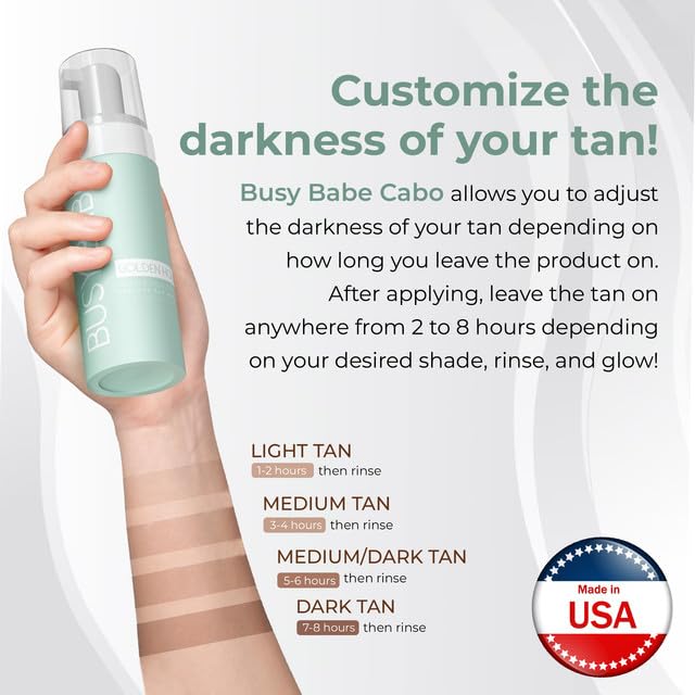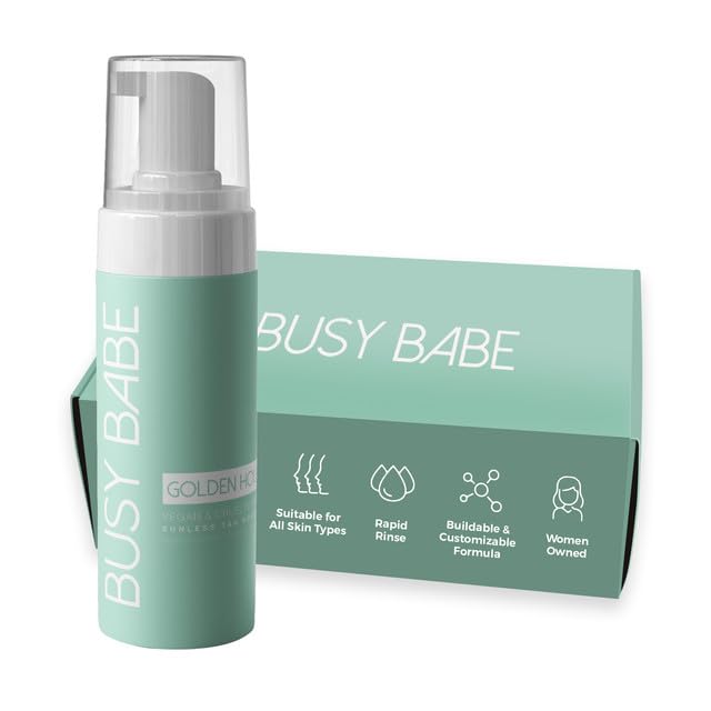- SEAMLESS APPLICATION: Experience a hassle-free application process with Busy Babe Golden Hour Rapid Bronze sunless tanner. Provide a streak-free finish every time, so you can flaunt your luminous radiance with confidence. Made with a unique blend of ingredients, our foam tanning mousse ensures faultless results, leaving you with a flawless tan that lasts. Say goodbye to streaks and hello to flawless radiance with Busy Babe.